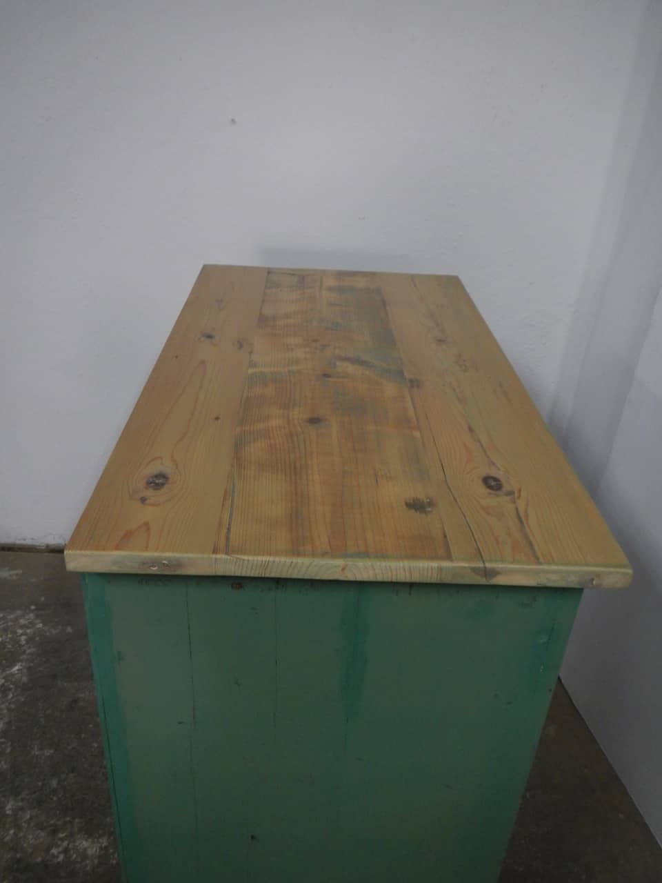 La schiena in legno compresso. Piano superiore in legno di abete naturale. Restaurato e lasciato in patina.