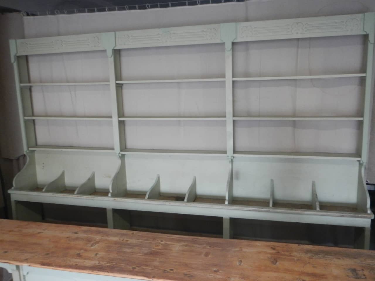 Informazioni sull'acquistoBancone e retro banco di negozio cartoleria in abete colorato verde. Il bancone misura cm 380×59 h93 ed e composto da 3 cassetti. 2 vani con mensole e un vano chiuso con porte e vetro. All’interno cassetto segreto . Il retro misura cm 364×46 h258. La parte alta è smontabile in 2 pezzi con una sbarra di ferro che li tiene uniti.Con 9 mensole e 9 contenitori portaoggetti di cm 37 di larghezza. La parte superiore è intagliata con disegno. Completamente restaurato e lasciato in patina