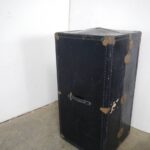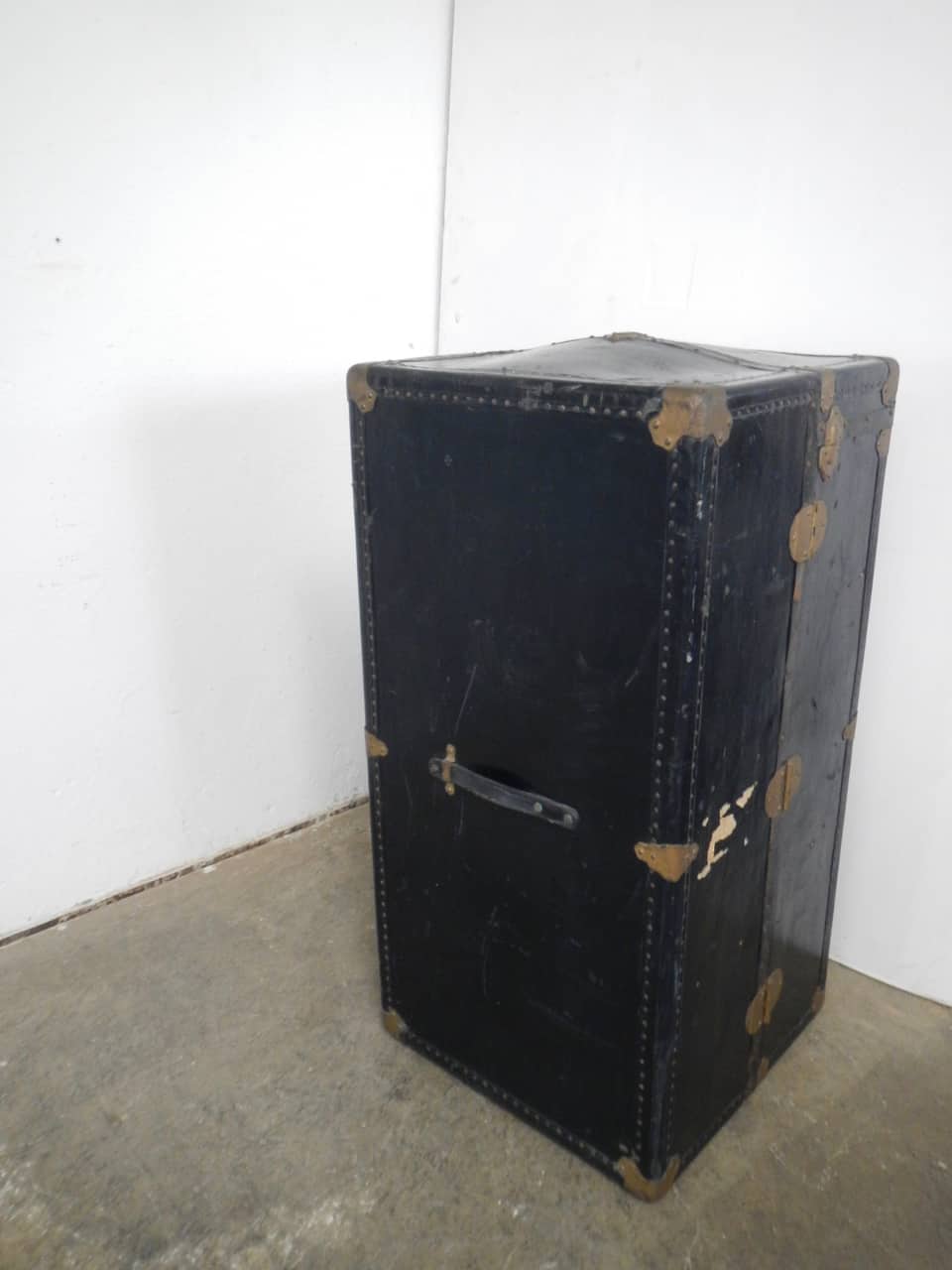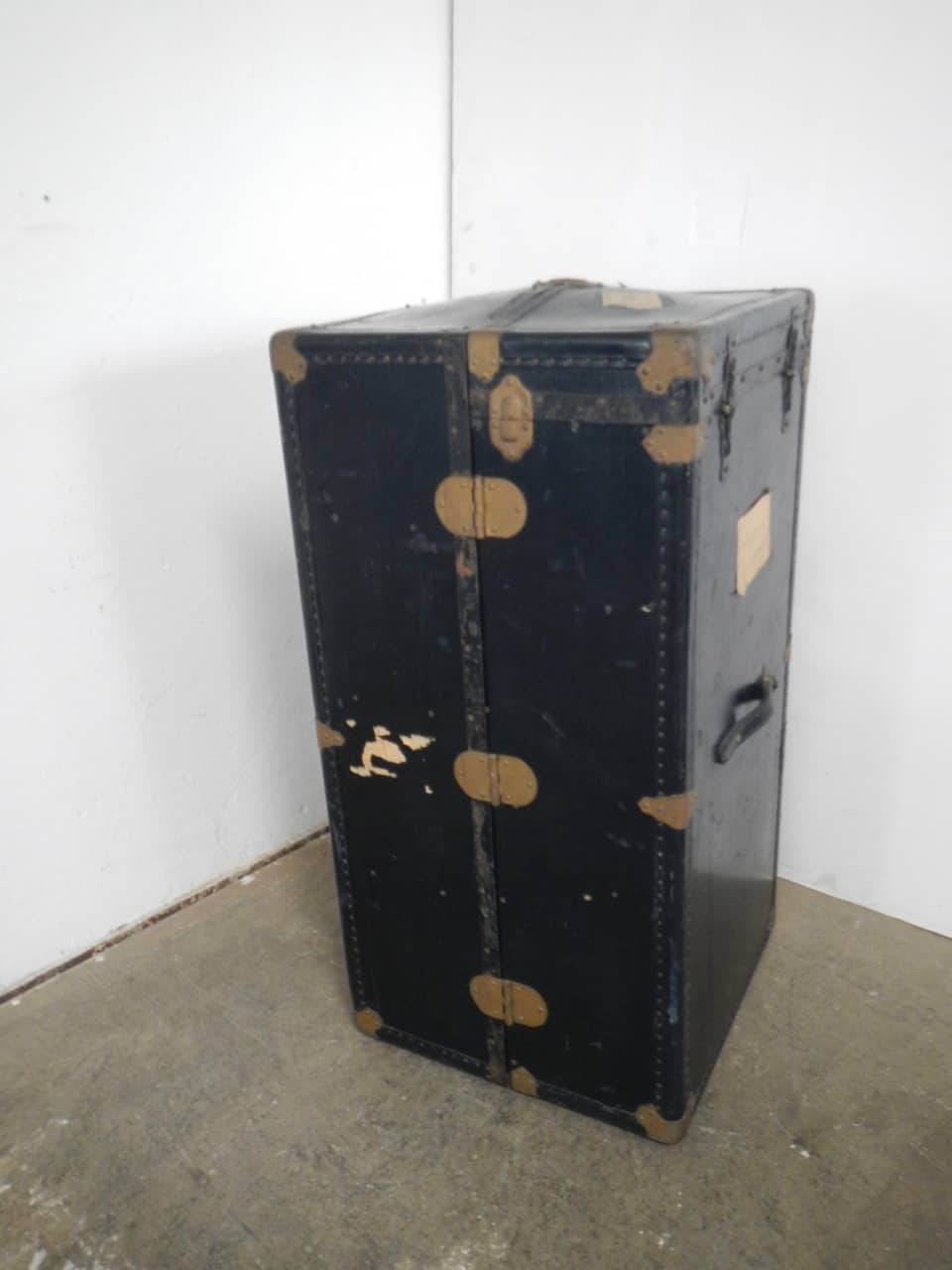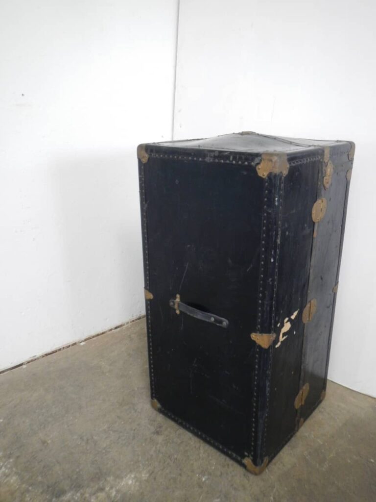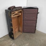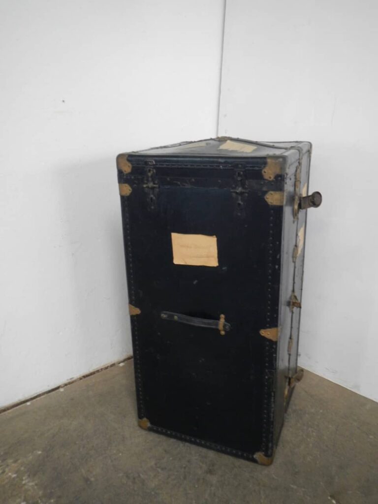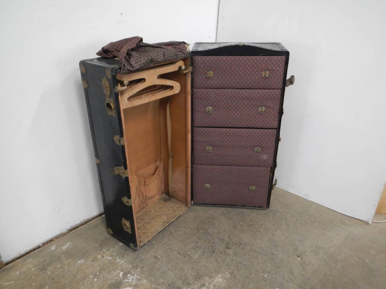 Baule porta vestiti in legno compresso con rivestimento in cartone con 4 cassetti interni e vano con 5 appendini in legno apribile nella parte superiore. Cassetti rivestiti in tessuti e chiusure in metallo. Le serrature sono difettose e non permettono la chiusura totale del baule. Mancano le chiavi