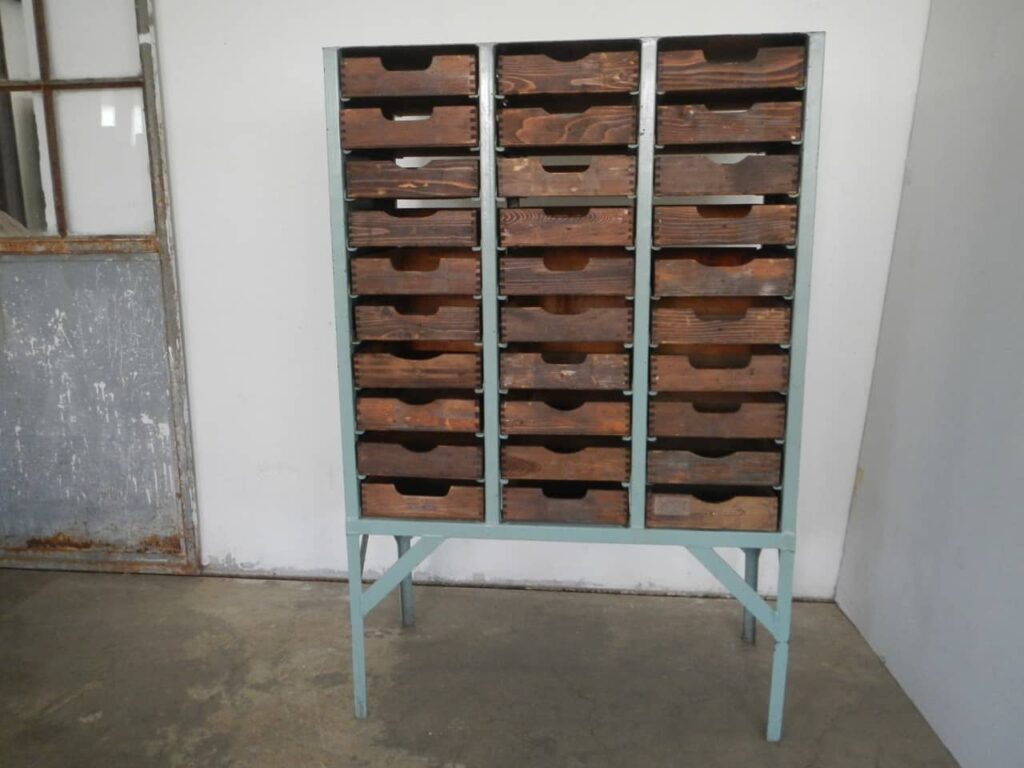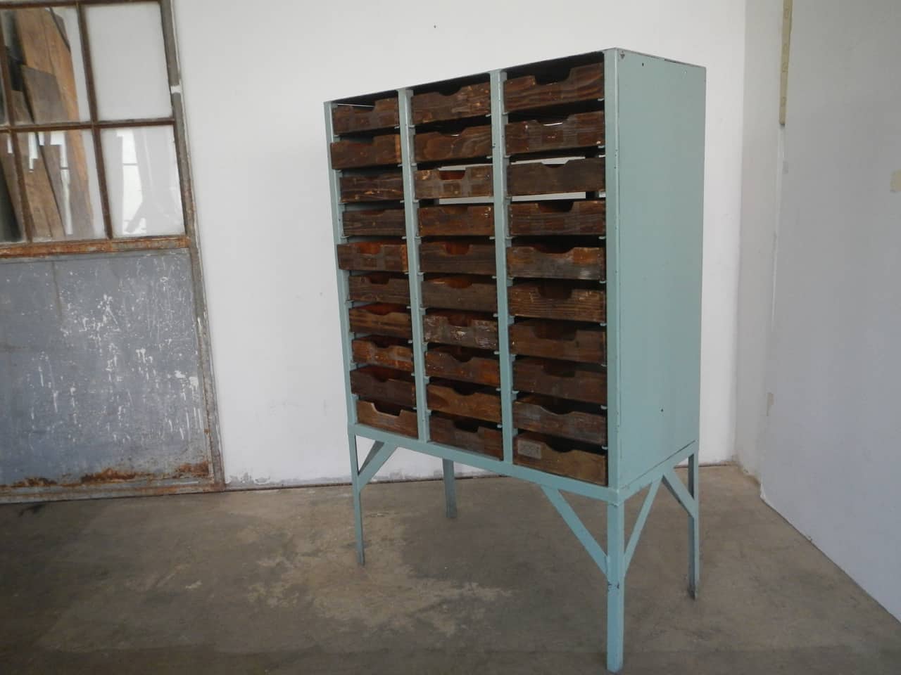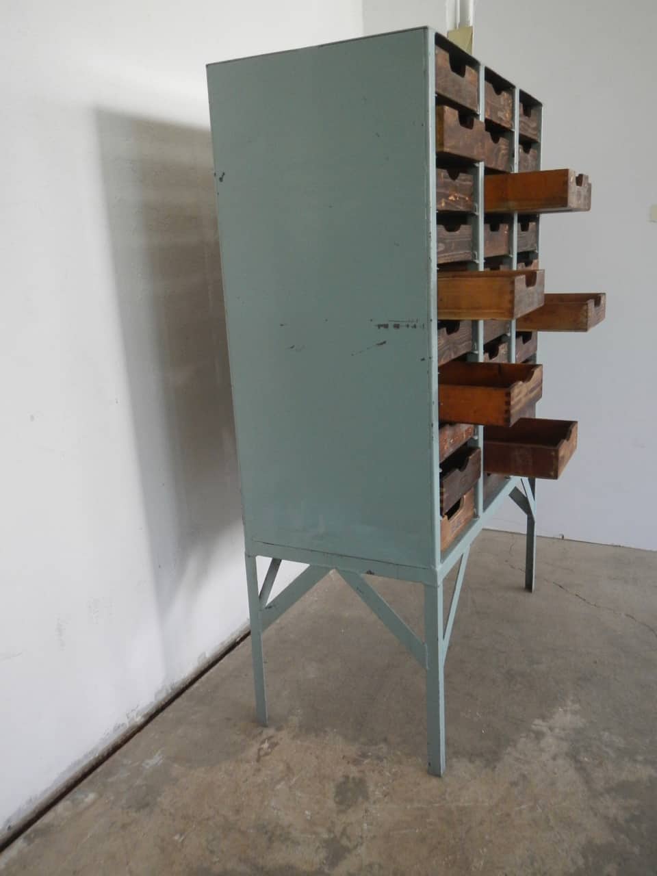 Cassettiera in metallo colorato verde e 30 cassetti in legno di abete Pulita e trattata con cera da legno e ferro