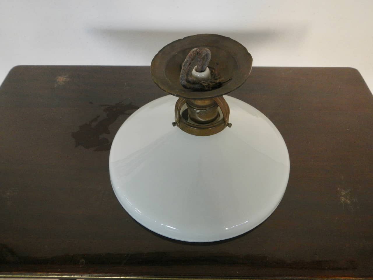 Informazioni sull'acquistoLampadario in vetro opalino con sostegno originale in rame. Impianto da sistemare