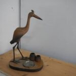 Informazioni sull'acquistoPortacenere e portafiammiferi con figura di uccello in legno di acero intagliato a mano. Gambe in ferro. In ottime condizioni