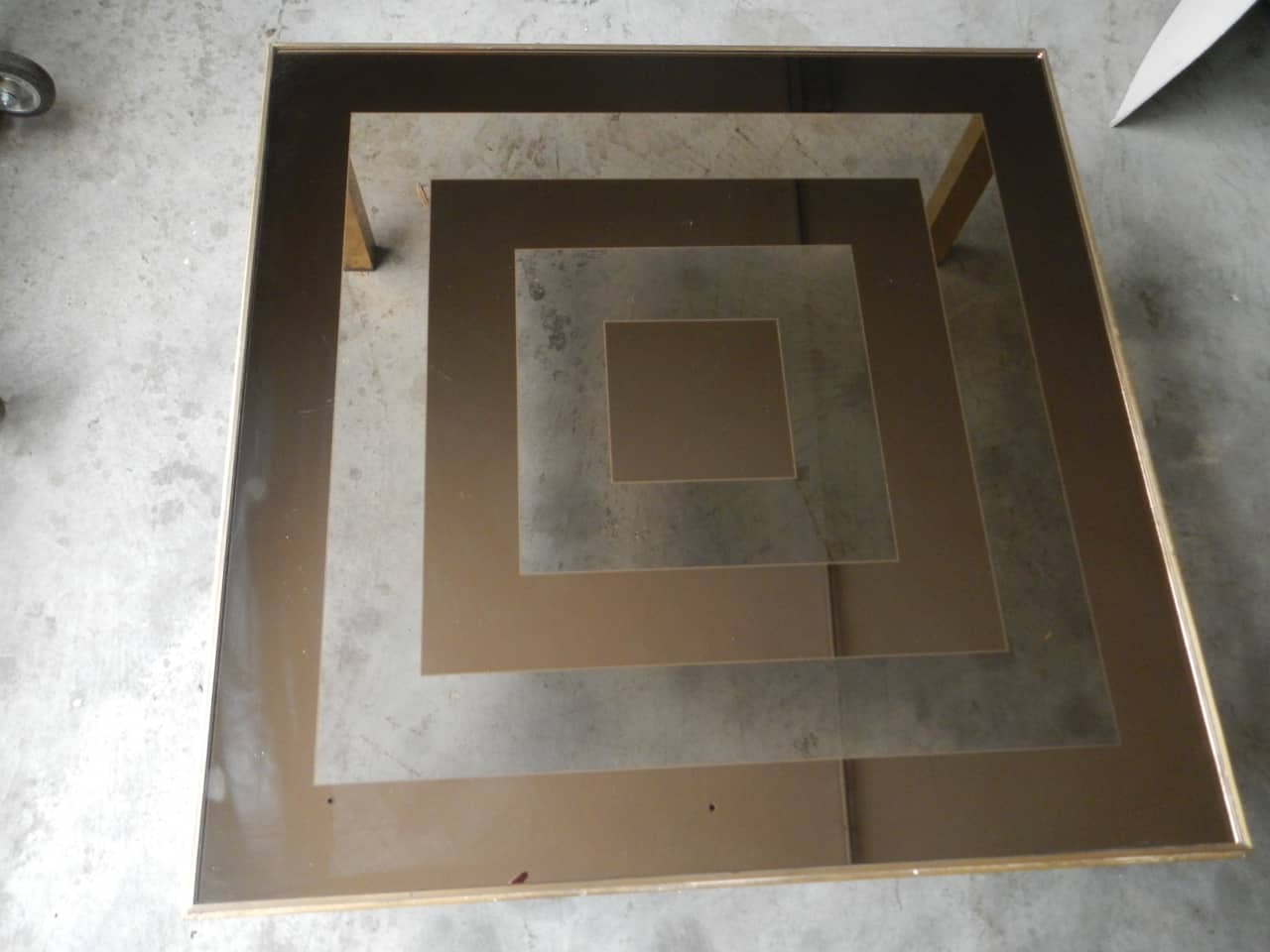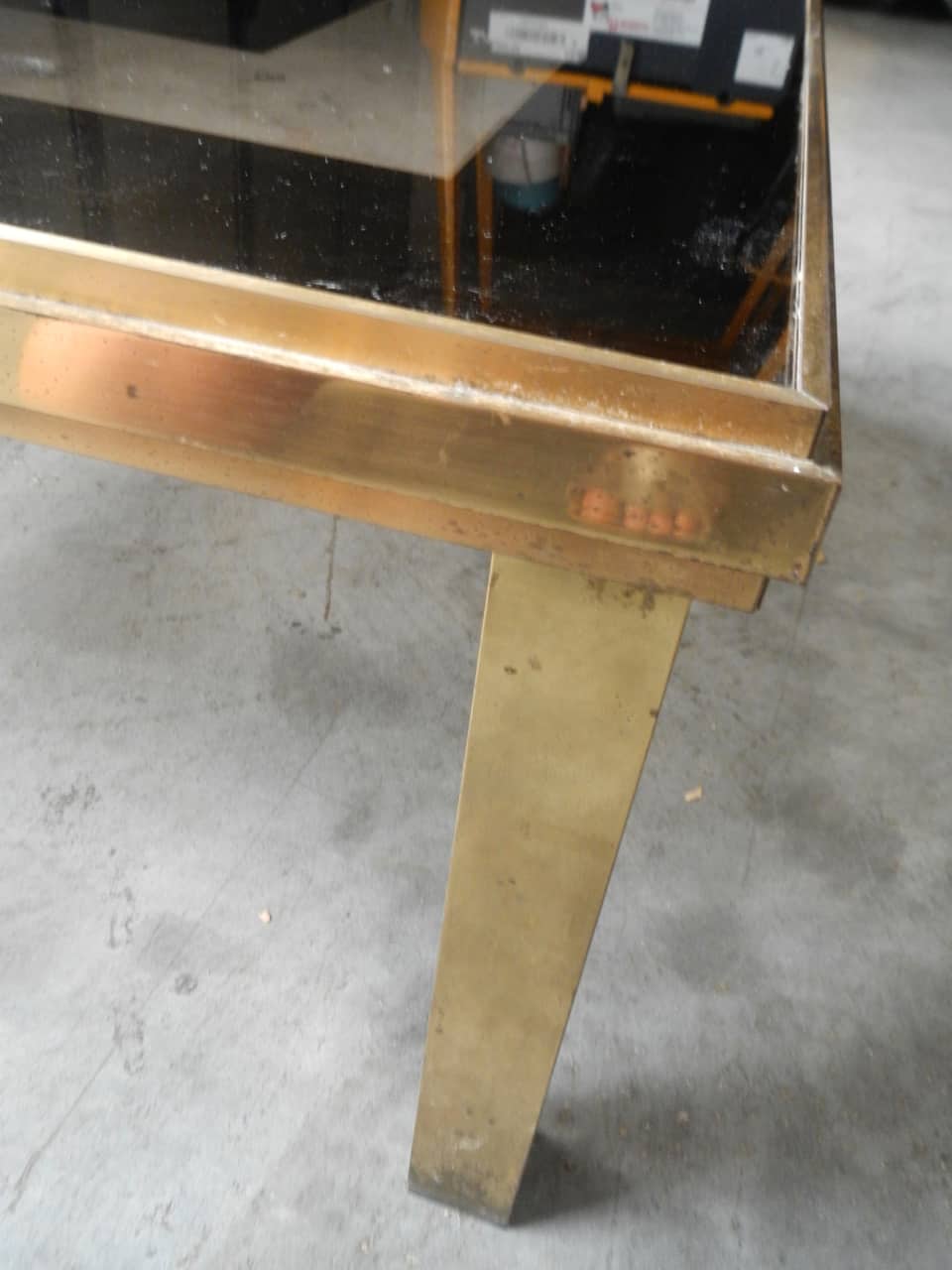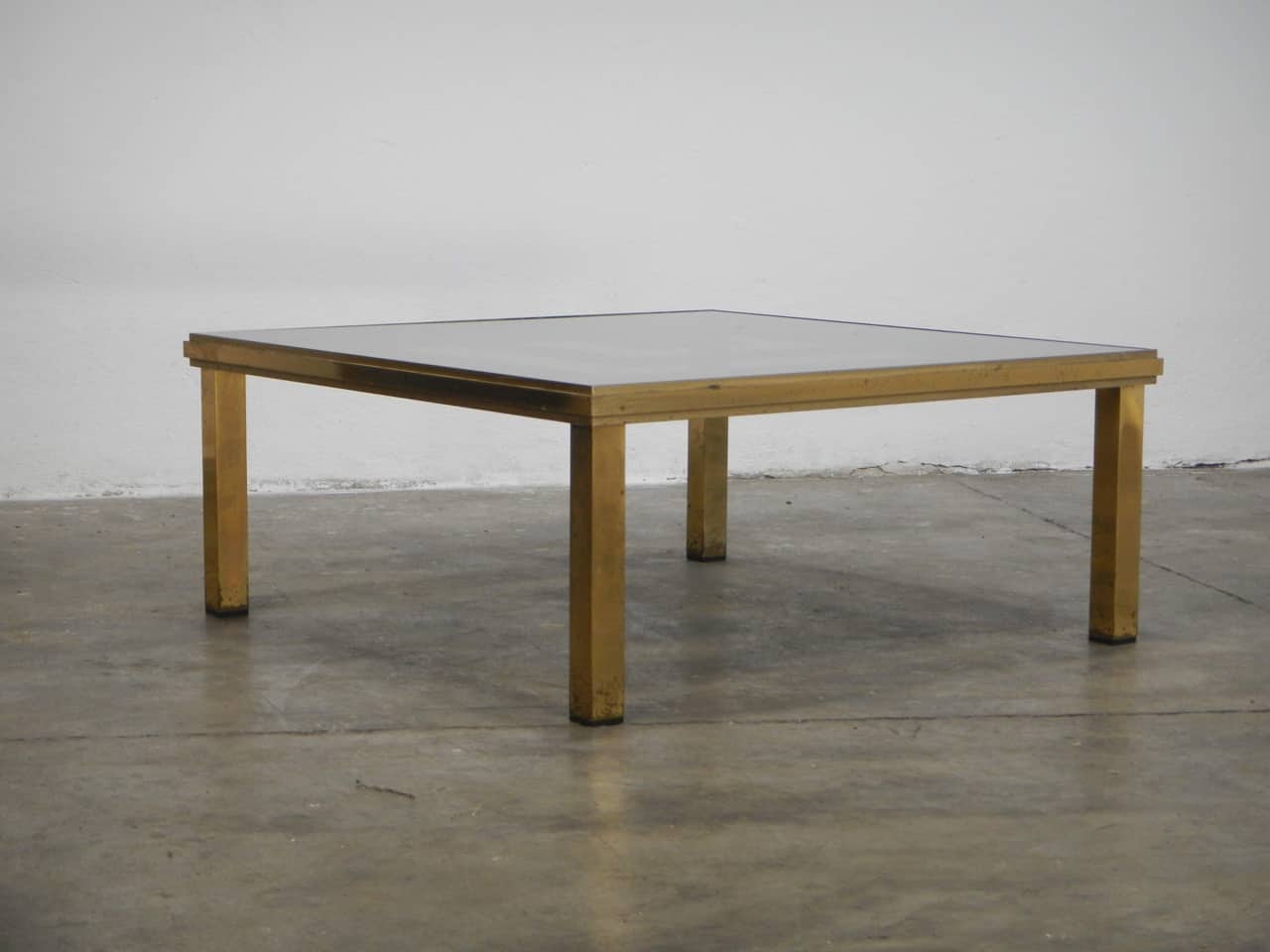 Tavolo da salotto con gambe in metallo ottonato e piano in vetro riquadrato